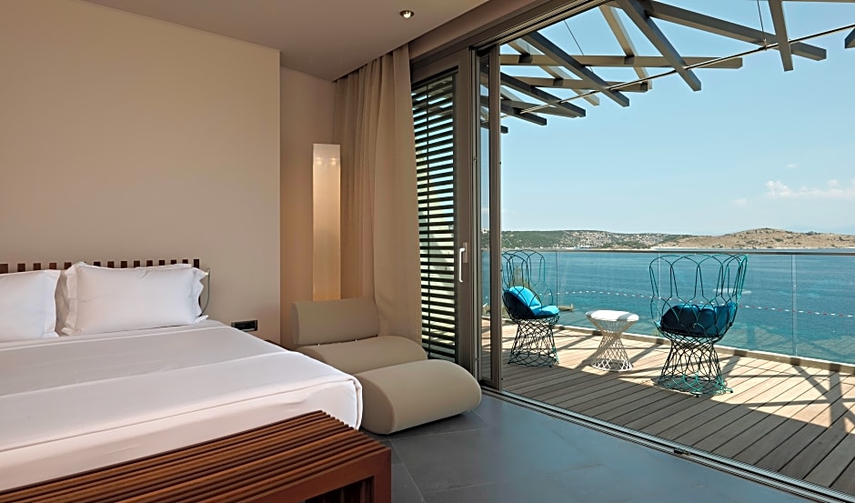 Located on the top floors, the extra large suite features panoramic views of the Aegean sea and a private furnished balcony. It includes an LCD TV, sofa and a coffee maker.